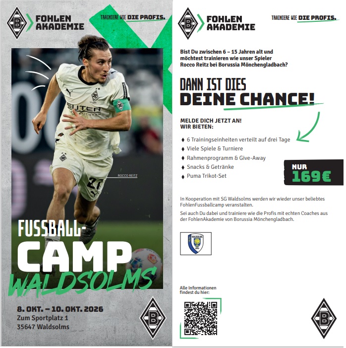 führt in den Herbstferien 2026 vom 08.10.-10.10.2026 zum dritten Mal ein Fussballcamp zusammen mit der SG 2010 Waldsolms durch. Die Anmeldung ist ab sofort möglich. Zur Anmeldung gelangt ihr hier.